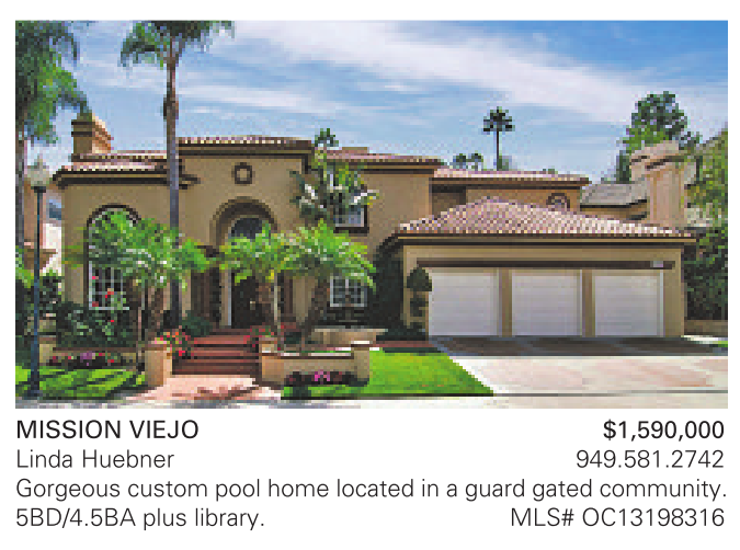 MISSION VIEJO $1,590,000 Linda Huebner 949.581.2742 Gorgeous custom pool home located in a guard gated community. 5BD/4.5BA plus library. MLS# OC13198316