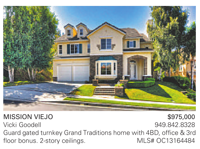 MISSION VIEJO $975,000 Vicki Goodell 949.842.8328 Guard gated turnkey Grand Traditions home with 4BD,office &3rd floor bonus. 2-story ceilings. MLS# OC13164484