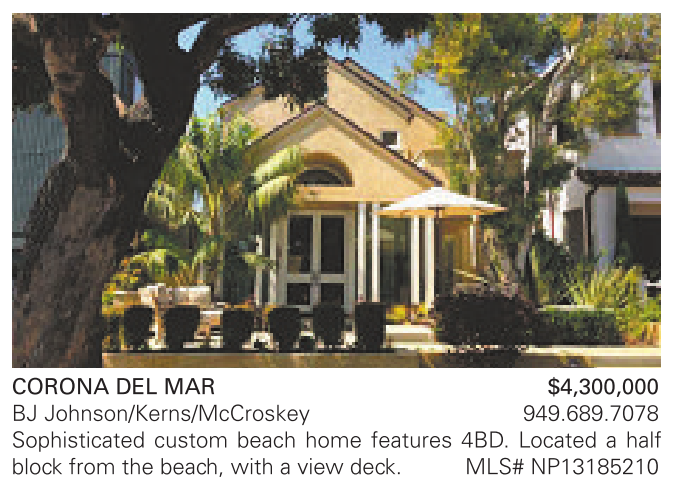CORONA DEL MAR $4,300,000 BJ Johnson/Kerns/McCroskey 949.689.7078 Sophisticated custom beach home features 4BD. Located a half block from the beach, with a view deck. MLS# NP13185210