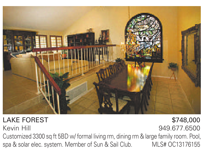 LAKE FOREST $748,000 Kevin Hill 949.677.6500 Customized 3300 sq ft 5BD w/ formal living rm, dining rm &large family room. Pool, spa &solar elec. system. Member of Sun &Sail Club. MLS# OC13176155