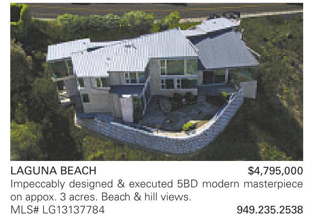 LAGUNA BEACH $4,795,000 Impeccably designed & executed 5BD modern masterpiece on appox. 3 acres. Beach & hill views. MLS# LG13137784 949.235.2538