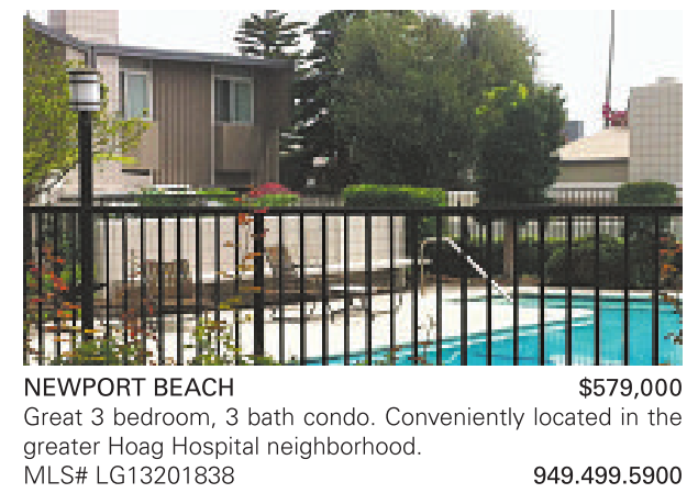 NEWPORT BEACH $579,000 Great 3 bedroom, 3 bath condo. Conveniently located in the greater Hoag Hospital neighborhood. MLS# LG13201838 949.499.5900