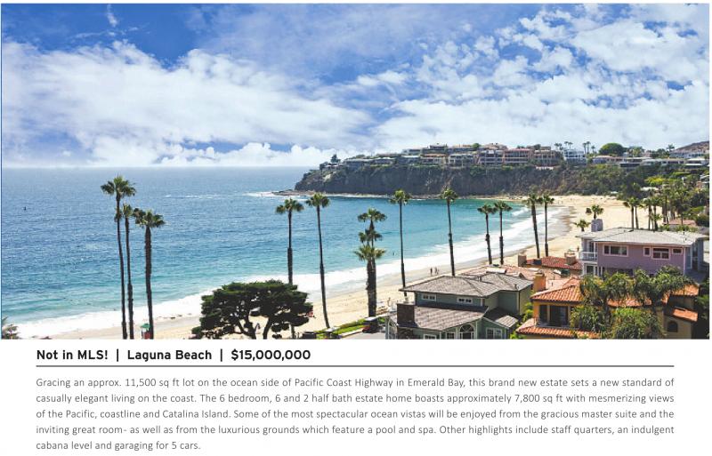 Not in MLS! | Laguna Beach | $15,000,000 Gracing an approx. 11,500 sq ft lot on the ocean side of Pacific Coast Highway in Emerald Bay, this brand new estate sets a new standard of casually elegant living on the coast. The 6 bedroom, 6 and 2 half bath estate home boasts approximately 7,800 sq ft with mesmerizing views of the Pacific, coastline and Catalina Island. Some of the most spectacular ocean vistas will be enjoyed from the gracious master suite and the inviting great room- as well as from the luxurious grounds which feature a pool and spa. Other highlights include staff quarters, an indulgent cabana level and garaging for 5 cars.