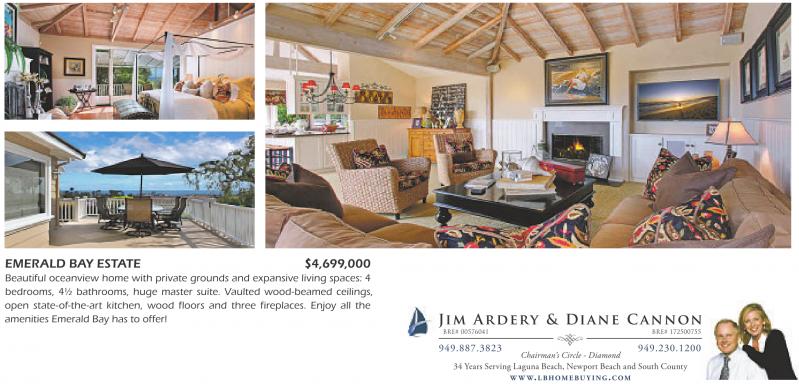 EMERALD BAY ESTATE $4,699,000 Beautiful oceanview home with private grounds and expansive living spaces: 4 bedrooms, 4½ bathrooms, huge master suite. Vaulted wood-beamed ceilings, open state-of-the-art kitchen, wood floors and three fireplaces. Enjoy all the amenities Emerald Bay has to offer!
