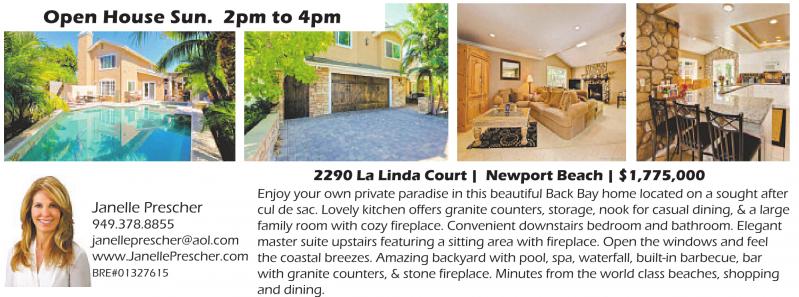 Open House Sun. 2pm to 4pm Janelle Prescher 949.378.8855 janelleprescher@aol.com www.JanellePrescher.com BRE#01327615 2290 La Linda Court | Newport Beach | $1,775,000 Enjoy your own private paradise in this beautiful Back Bay home located on a sought after cul de sac. Lovely kitchen offers granite counters, storage, nook for casual dining, & a large family room with cozy fireplace. Convenient downstairs bedroom and bathroom. Elegant master suite upstairs featuring a sitting area with fireplace. Open the windows and feel the coastal breezes. Amazing backyard with pool, spa, waterfall, built-in barbecue, bar with granite counters, & stone fireplace. Minutes from the world class beaches, shopping and dining.