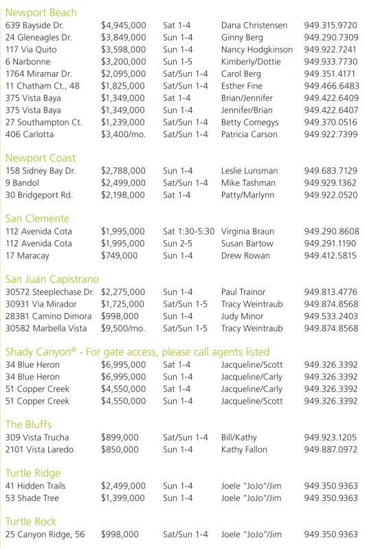 Newport Beach 639 Bayside Dr. $4,945,000 Sat 1-4 Dana Christensen 949.315.9720 24 Gleneagles Dr. $3,849,000 Sun 1-4 Ginny Berg 949.290.7309 117 Via Quito $3,598,000 Sun 1-4 Nancy Hodgkinson 949.922.7241 6 Narbonne $3,200,000 Sun 1-5 Kimberly/Dottie 949.933.7730 1764 Miramar Dr. $2,095,000 Sat/Sun 1-4 Carol Berg 949.351.4171 11 Chatham Ct., 48 $1,825,000 Sat/Sun 1-4 Esther Fine 949.466.6483 375 Vista Baya $1,349,000 Sat 1-4 Brian/Jennifer 949.422.6409 375 Vista Baya $1,349,000 Sun 1-4 Jennifer/Brian 949.422.6407 27 Southampton Ct. $1,239,000 Sat/Sun 1-4 Betty Comegys 949.370.0516 406 Carlotta $3,400/mo. Sat/Sun 1-4 Patricia Carson 949.922.7399 Newport Coast 158 Sidney Bay Dr. $2,788,000 Sun 1-4 Leslie Lunsman 949.683.7129 9 Bandol $2,499,000 Sat/Sun 1-4 Mike Tashman 949.929.1362 30 Bridgeport Rd. $2,198,000 Sat 1-4 Patty/Marlynn 949.922.0520 San Clemente 112 Avenida Cota $1,995,000 Sat 1:30-5:30 Virginia Braun 949.290.8608 112 Avenida Cota $1,995,000 Sun 2-5 Susan Bartow 949.291.1190 17 Maracay $749,000 Sun 1-4 Drew Rowan 949.412.5815 San Juan Capistrano 30572 Steeplechase Dr. $2,275,000 Sun 1-4 Paul Trainor 949.813.4776 30931 Via Mirador $1,725,000 Sat/Sun 1-5 Tracy Weintraub 949.874.8568 28381 Camino Dimora $998,000 Sun 1-4 Judy Minor 949.533.2403 30582 Marbella Vista $9,500/mo. Sat/Sun 1-5 Tracy Weintraub 949.874.8568 Shady Canyon ® - For gate access, please call agents listed 34 Blue Heron $6,995,000 Sat 1-4 Jacqueline/Scott 949.326.3392 34 Blue Heron $6,995,000 Sun 1-4 Jacqueline/Carly 949.326.3392 51 Copper Creek $4,550,000 Sat 1-4 Jacqueline/Carly 949.326.3392 51 Copper Creek $4,550,000 Sun 1-4 Jacqueline/Scott 949.326.3392 The Bluffs 309 Vista Trucha $899,000 Sat/Sun 1-4 Bill/Kathy 949.923.1205 2101 Vista Laredo $850,000 Sun 1-4 Kathy Fallon 949.887.0972 Turtle Ridge 41 Hidden Trails $2,499,000 Sun 1-4 Joele "JoJo"/Jim 949.350.9363 53 Shade Tree $1,399,000 Sun 1-4 Joele "JoJo"/Jim 949.350.9363 Turtle Rock 25 Canyon Ridge, 56 $998,000 Sat/Sun 1-4 Joele “JoJo”/Jim 949.350.9363
