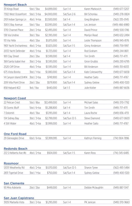 Newport Beach 311 Kings Road 5bd /5ba $4,899,000 Sun 1-4 KarenMarkovich (949) 677-3207 7302 West Oceanfront 5bd /3+ba $4,000,000 Sat/Sun 2-6 Bill Schonlau (949) 278-0824 2101Indian Springs Ln 4bd /4+ba $3,500,000 Sat1-4 Greg Bingham (562) 335-0145 300 EBay Avenue 5bd /5ba $3,095,000 Sat/Sun 1-4 LesJenison (949) 466-6980 3710 Channel Place 2bd /2+ba $2,495,000 Sun 1-4 David Prince (949) 500-1746 138 ViaUndine 3bd /3ba $2,395,000 Sun 1-4 Marilyn Read (949) 632-2494 113 ViaYella 4bd /2ba $1,875,000 Sun 1-4 Leslie Thompson (949) 945-8176 1901YachtEnchantress 4bd /2+ba $1,825,000 Sat/Sun 1-5 GinnyAnderson (949) 759-1997 2033 YachtDefender 4bd /3+ba $1,725,000 Sun 1-4 RodGraham (949) 244-8611 901ClayStreet 2bd /2ba $1,599,000 Sat1-4 TimSmith (949) 717-4711 369Santa Isabel Ave 3bd /2+ba $1,595,000 Sun 1-4 Giron Grubbs (949) 293-6795 2520 Cliff Drive 4bd /3+ba $1,595,000 Sun 1-4 Bill Anderson (949) 351-6033 675Vista Bonita 3bd /1+ba $1,080,000 Sat/Sun 1-4 Kate Colesworthy (949) 677-6658 14 CanyonIsland Dr#14 3bd /2+ba $749,900 Sun 1-4 Heather Saito (949) 717-4767 209 Villa PointDrive 2bd /2ba $579,900 Sat/Sun 1-4 SydneyGielow (949) 400-1320 858 Halyard#22 1bd /1ba $440,000 Sat1-3 Julie Kistler (949) 887-6636