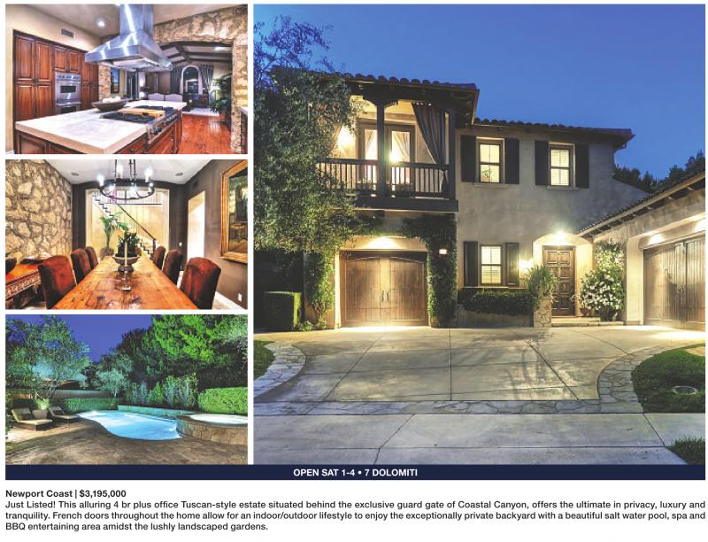 OPEN SAT 1-4 • 7 DOLOMITI Newport Coast | $3,195,000 Just Listed! This alluring 4 br plus office Tuscan-style estate situated behind the exclusive guard gate of Coastal Canyon, offers the ultimate in privacy, luxury and tranquility. French doors throughout the home allow for an indoor/outdoor lifestyle to enjoy the exceptionally private backyard with a beautiful salt water pool, spa and BBQ entertaining area amidst the lushly landscaped gardens.