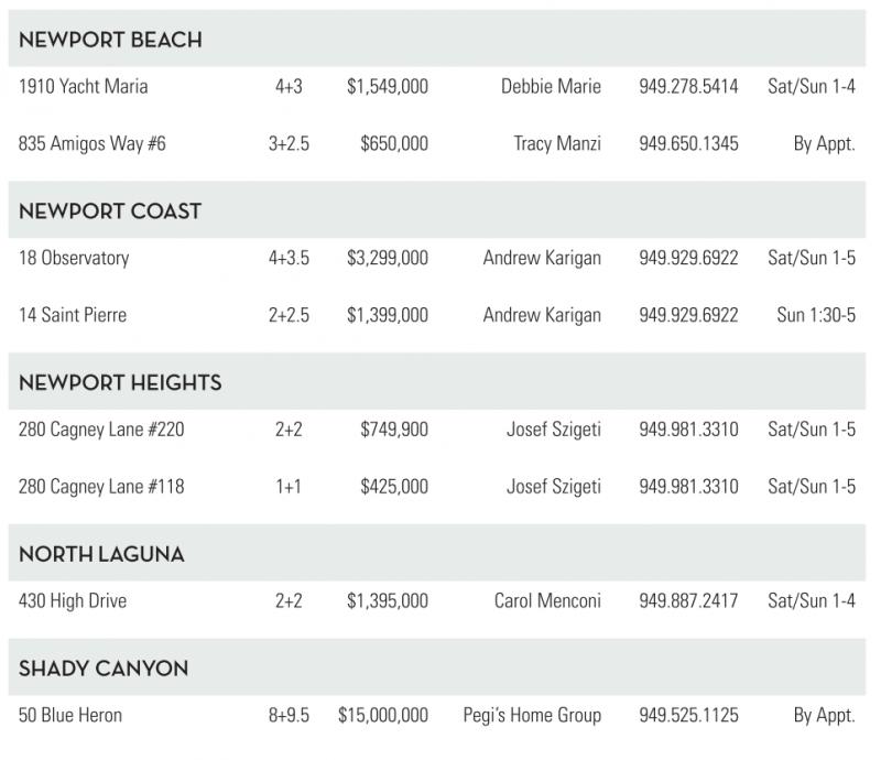 NEWPORTBEACH 1910 Yacht Maria 4+3 $1,549,000 Debbie Marie 949.278.5414 Sat/Sun 1-4 835 Amigos Way#6 3+2.5 $650,000 Tracy Manzi 949.650.1345 By Appt. NEWPORTCOAST 18 Observatory 4+3.5 $3,299,000 Andrew Karigan 949.929.6922 Sat/Sun 1-5 14 Saint Pierre 2+2.5 $1,399,000 Andrew Karigan 949.929.6922 Sun 1:30-5 NEWPORTHEIGHTS 280 Cagney Lane #220 2+2 $749,900 Josef Szigeti 949.981.3310 Sat/Sun 1-5 280 Cagney Lane #118 1+1 $425,000 Josef Szigeti 949.981.3310 Sat/Sun 1-5 NORTH GUNA 430 High Drive 2+2 $1,395,000 Carol Menconi 949.887.2417 Sat/Sun 1-4 SHADYCANYON 50 Blue Heron 8+9.5 $15,000,000 Pegi’sHome Group 949.525.1125 By Appt. See also