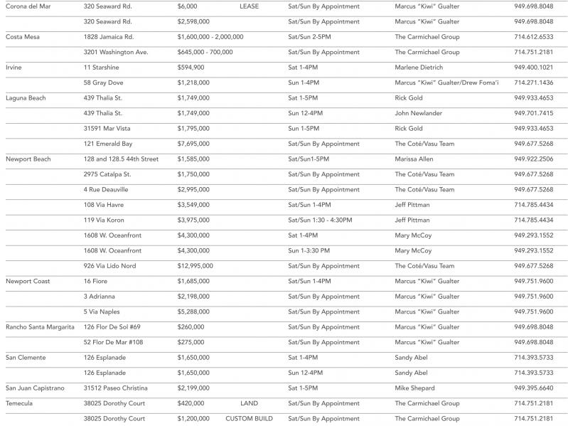 Laguna Beach 439 Thalia St. $1,749,000 Sat 1-5PM Rick Gold 949.933.4653 439 Thalia St. $1,749,000 Sun 12-4PM John Newlander 949.701.7415 31591 Mar Vista $1,795,000 Sun 1-5PM Rick Gold 949.933.4653 121 Emerald Bay $7,695,000 Sat/Sun By Appointment The Coté/Vasu Team 949.677.5268 Newport Beach 128 and 128.5 44th Street $1,585,000 Sat/Sun1-5PM Marissa Allen 949.922.2506 2975 Catalpa St. $1,750,000 Sat/Sun By Appointment The Coté/Vasu Team 949.677.5268 4 Rue Deauville $2,995,000 Sat/Sun By Appointment The Coté/Vasu Team 949.677.5268 108 Via Havre $3,549,000 Sat/Sun 1-4PM Jeff Pittman 714.785.4434 119 Via Koron $3,975,000 Sat/Sun 1:30 - 4:30PM Jeff Pittman 714.785.4434 1608 W. Oceanfront $4,300,000 Sat 1-4PM Mary McCoy 949.293.1552 1608 W. Oceanfront $4,300,000 Sun 1-3:30 PM Mary McCoy 949.293.1552 926 Via Lido Nord $12,995,000 Sat/Sun By Appointment The Coté/Vasu Team 949.677.5268 Newport Coast 16 Fiore $1,685,000 Sat/Sun 1-4PM Marcus “Kiwi” Gualter 949.751.9600 3 Adrianna $2,198,000 Sat/Sun By Appointment Marcus “Kiwi” Gualter 949.751.9600 5 Via Naples $5,288,000 Sat/Sun By Appointment Marcus “Kiwi” Gualter 949.751.9600 Rancho Santa Margarita 126 Flor De Sol #69 $260,000 Sat/Sun By Appointment Marcus “Kiwi” Gualter 949.698.8048 52 Flor De Mar #108 $275,000 Sat/Sun By Appointment Marcus “Kiwi” Gualter 949.698.8048 San Clemente 126 Esplanade $1,650,000 Sat 1-4PM Sandy Abel 714.393.5733 126 Esplanade $1,650,000 Sun 12-4PM Sandy Abel 714.393.5733 San Juan Capistrano 31512 Paseo Christina $2,199,000 Sat 1-5PM Mike Shepard 949.395.6640 Temecula 38025 Dorothy Court $420,000 LAND Sat/Sun By Appointment The Carmichael Group 714.751.2181 38025 Dorothy Court $1,200,000 CUSTOM BUILD Sat/Sun By Appointment The Carmichael Group 714.751.2181