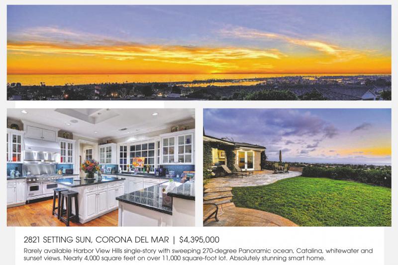 2821 SETTING SUN, CORONA DEL MAR | $4,395,000 Rarely available Harbor View Hills single-story with sweeping 270-degree Panoramic ocean, Catalina, whitewater and sunset views. Nearly 4,000 square feet on over 11,000 square-foot lot. Absolutely stunning smart home.