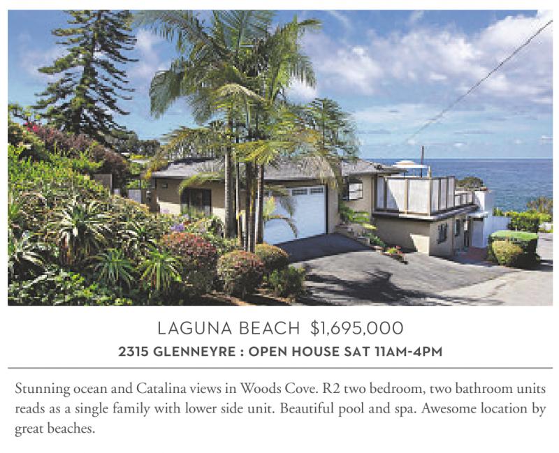 LAGUNA BEACH $1,695,000 2315 GLENNEYRE : OPEN HOUSE SAT 11AM-4PM Stunning ocean and Catalina views in Woods Cove. R2 two bedroom, two bathroom units reads as a single family with lower side unit. Beautiful pool and spa. Awesome location by great beaches.