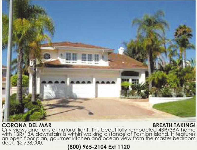 CORONA DEL MAR BREATH TAKING! City views and tons of natural light, this beautifully remodeled 4BR/3BA home with 1BR/1BA downstairs is within walking distance of Fashion Island. It features an open floor plan, gourmet kitchen and ocean view from the master bedroom deck. $2,738,000. (800) 965-2104 Ext 1120 See also
