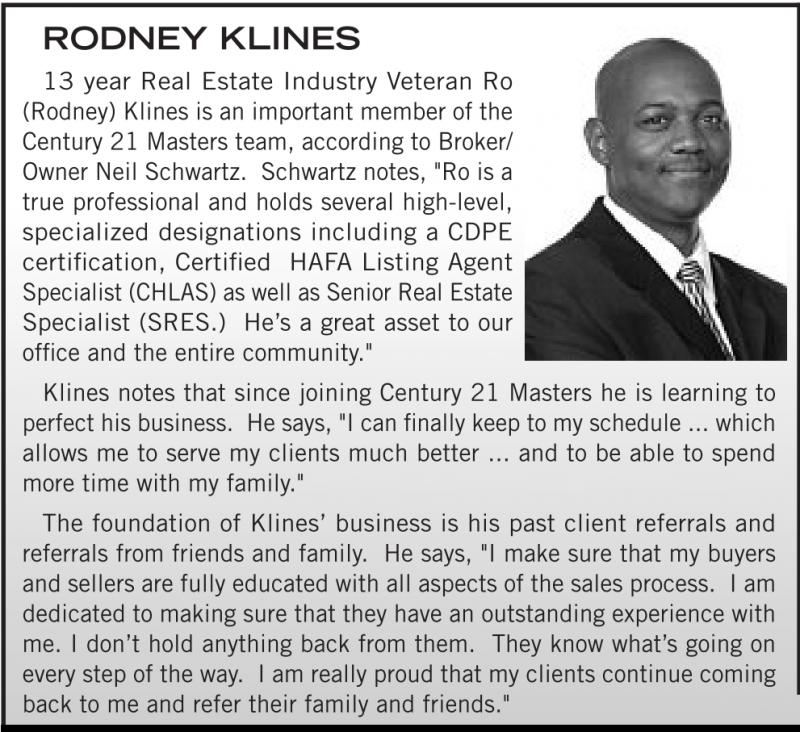 RODNEY KLINES 13 year Real Estate Industry Veteran Ro (Rodney) Klines is an important member of the Century 21 Masters team, according to Broker/ Owner Neil Schwartz. Schwartz notes, "Ro is a true professional and holds several high-level, specialized designations including a CDPE certification, Certified HAFA Listing Agent Specialist (CHLAS) as well as Senior Real Estate Specialist (SRES.) He’s a great asset to our office and the entire community." Klines notes that since joining Century 21 Masters he is learning to perfect his business. He says, "I can finally keep to my schedule ... which allows me to serve my clients much better ... and to be able to spend more time with my family." The foundation of Klines’ business is his past client referrals and referrals from friends and family. He says, "I make sure that my buyers and sellers are fully educated with all aspects of the sales process. I am dedicated to making sure that they have an outstanding experience with me. I don’t hold anything back from them. They know what’s going on every step of the way. I am really proud that my clients continue coming back to me and refer their family and friends."