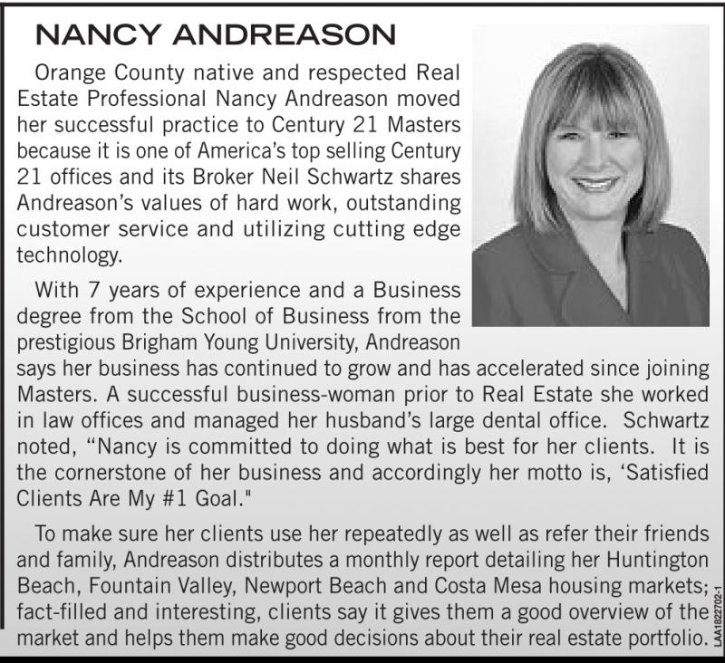 NANCY ANDREASON Orange County native and respected Real Estate Professional Nancy Andreason moved her successful practice to Century 21 Masters because it is one of America’s top selling Century 21 offices and its Broker Neil Schwartz shares Andreason’s values of hard work, outstanding customer service and utilizing cutting edge technology. With 7 years of experience and a Business degree from the School of Business from the prestigious Brigham Young University, Andreason says her business has continued to grow and has accelerated since joining Masters. A successful business-woman prior to Real Estate she worked in law offices and managed her husband’s large dental office. Schwartz noted, “Nancy is committed to doing what is best for her clients. It is the cornerstone of her business and accordingly her motto is, ‘Satisfied Clients Are My #1 Goal." To make sure her clients use her repeatedly as well as refer their friends and family, Andreason distributes a monthly report detailing her Huntington Beach, Fountain Valley, Newport Beach and Costa Mesa housing markets; fact-filled and interesting, clients say it gives them a good overview of the market and helps them make good decisions about their real estate portfolio.