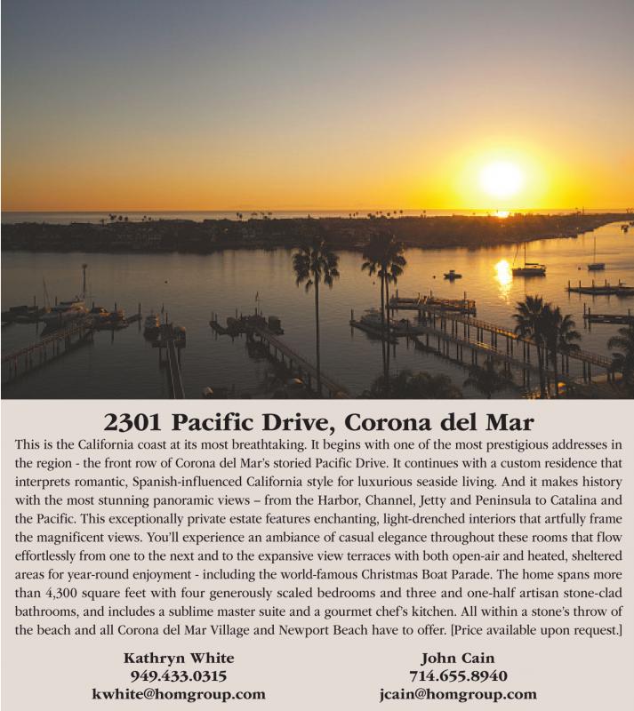 2301 Pacific Drive, Corona del Mar This is the California coast at its most breathtaking. It begins with one of the most prestigious addresses in the region - the front row of Corona del Mar’s storied Pacific Drive. It continues with a custom residence that interprets romantic, Spanish-influenced California style for luxurious seaside living. And it makes history with the most stunning panoramic views – from the Harbor, Channel, Jetty and Peninsula to Catalina and the Pacific. This exceptionally private estate features enchanting, light-drenched interiors that artfully frame the magnificent views. You’ll experience an ambiance of casual elegance throughout these rooms that flow effortlessly from one to the next and to the expansive view terraces with both open-air and heated, sheltered areas for year-round enjoyment - including the world-famous Christmas Boat Parade. The home spans more than 4,300 square feet with four generously scaled bedrooms and three and one-half artisan stone-clad bathrooms, and includes a sublime master suite and a gourmet chef’s kitchen. All within a stone’s throw of the beach and all Corona del Mar Village and Newport Beach have to offer. [Price available upon request.] Kathryn White 949.433.0315 kwhite@homgroup.com John Cain 714.655.8940 jcain@homgroup.com