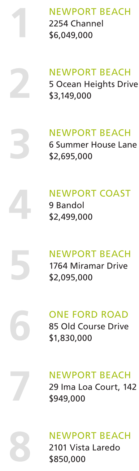 1 2 NEWPORT BEACH 2254 Channel $6,049,000 NEWPORT BEACH 5 Ocean Heights Drive $3,149,000 3 4 5 6 7 8 NEWPORT BEACH 6 Summer House Lane $2,695,000 NEWPORT COAST 9 Bandol $2,499,000 NEWPORT BEACH 1764 Miramar Drive $2,095,000 ONE FORD ROAD 85 Old Course Drive $1,830,000 NEWPORT BEACH 29 Ima Loa Court, 142 $949,000 NEWPORT BEACH 2101 Vista Laredo $850,000