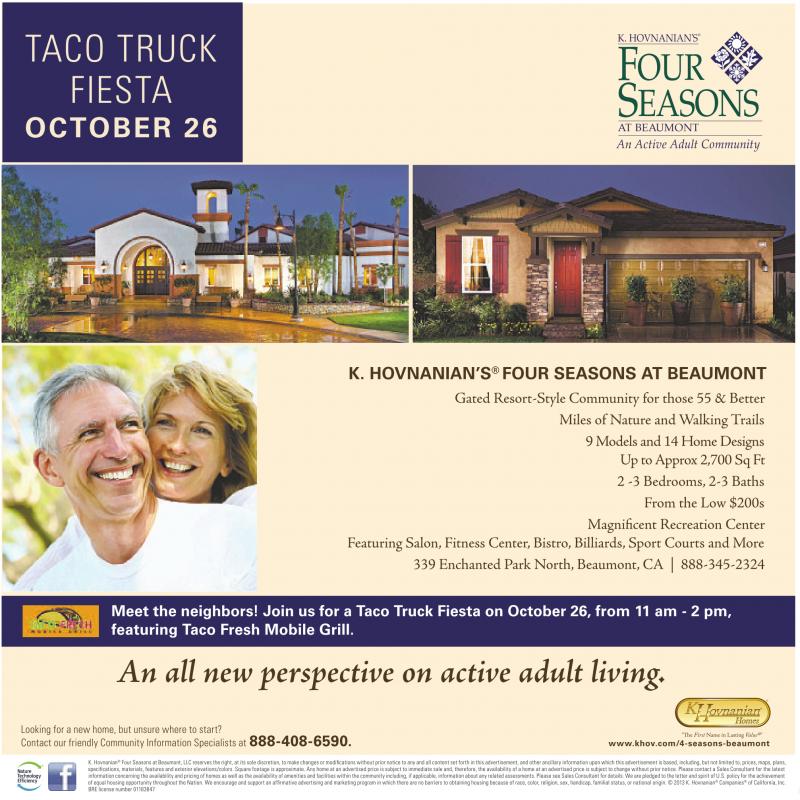 TACO T RUCK FIESTA O C TO B E R 2 6 www.khov.com/4-seasons-beaumont K. Hovnanian ® Four Seasons at Beaumont,LLC reserves theright,atits sole discretion,tomakechanges or modifications withoutprior notice to anyand allcontent setforth in this advertisement, andother ancillaryinformation upon whichthis advertisementisbased,including, butnot limited to,prices,maps, plans, specifications,materials, features andexteriorelevations/colors.Squarefootage is approximate.Any homeatanadvertised price is subject to immediate sale and, therefore,the availability of ahome at an advertised price is subject to change without prior notice.Pleasecontact aSales Consultant forthe latest informationconcerningthe availability andpricing of homesaswellasthe availability of amenities andfacilities within thecommunityincluding, if applicable, informationabout anyrelated assessments.Pleasesee SalesConsultantfor details. We arepledgedtothe letter andspiritofU.S. policy forthe achievement of equalhousingopportunity throughout theNation. We encourage andsupport an affirmativeadvertisingand marketingprograminwhichthere arenobarrierstoobtaininghousingbecause of race,color,religion, sex, handicap,familial status,ornationalorigin.©2013K.Hovnanian ® Companies ® of California, Inc. BRElicense number 01183847