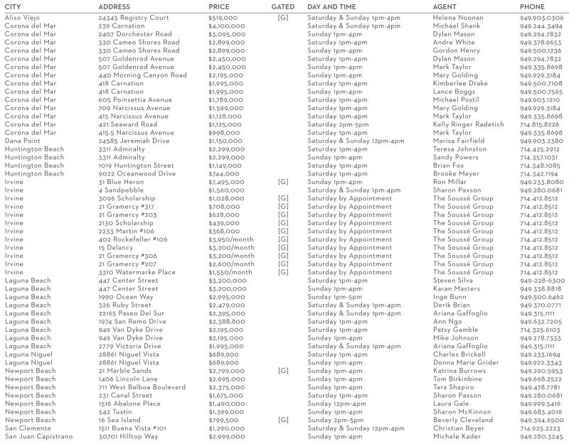 Aliso Viejo 24345 Registry Court $519,000 [G] Saturday & Sunday 1pm-4pm Helena Noonan 949.903.0306 Corona del Mar 239 Carnation $4,100,000 Saturday & Sunday 1pm-4pm Michael Shank 949.244.3494 Corona del Mar 2407 Dorchester Road $3,095,000 Sunday 1pm-4pm Dylan Mason 949.294.7832 Corona del Mar 330 Cameo Shores Road $2,899,000 Saturday 1pm-4pm Andre White 949.378.9653 Corona del Mar 330 Cameo Shores Road $2,899,000 Sunday 1pm-4pm Gordon Henry 949.500.1236 Corona del Mar 507 Goldenrod Avenue $2,450,000 Saturday 1pm-4pm Dylan Mason 949.294.7832 Corona del Mar 507 Goldenrod Avenue $2,450,000 Sunday 1pm-4pm Mark Taylor 949.335.8698 Corona del Mar 440 Morning Canyon Road $2,195,000 Sunday 1pm-4pm Mary Golding 949.929.3184 Corona del Mar 418 Carnation $1,995,000 Saturday 1pm-4pm Kimberlee Drake 949.500.7108 Corona del Mar 418 Carnation $1,995,000 Sunday 1pm-4pm Lance Boggs 949.500.7565 Corona del Mar 605 Poinsettia Avenue $1,789,000 Saturday 1pm-4pm Michael Postil 949.903.1210 Corona del Mar 709 Narcissus Avenue $1,599,000 Saturday 1pm-4pm Mary Golding 949.929.3184 Corona del Mar 415 Narcissus Avenue $1,128,000 Saturday 1pm-4pm Mark Taylor 949.335.8698 Corona del Mar 421 Seaward Road $1,125,000 Saturday 2pm-5pm Kelly Ringer Radetich 714.815.8226 Corona del Mar 415.5 Narcissus Avenue $998,000 Saturday 1pm-4pm Mark Taylor 949.335.8698 Dana Point 24585 Jeremiah Drive $1,150,000 Saturday & Sunday 12pm-4pm Marisa Fairfield 949.903.2380 Huntington Beach 3311 Admiralty $2,299,000 Saturday 1pm-4pm Teresa Johnston 714.425.2912 Huntington Beach 3311 Admiralty $2,299,000 Sunday 1pm-4pm Sandy Powers 714.357.1031 Huntington Beach 1019 Huntington Street $1,149,000 Saturday 1pm-4pm Brian Fox 714.348.1085 Huntington Beach 9022 Oceanwood Drive $744,000 Saturday 1pm-4pm Brooke Meyer 714.342.1194 Irvine 31 Blue Heron $7,495,000 [G] Sunday 1pm-4pm Ron Millar 949.233.8080 Irvine 4 Sandpebble $1,560,000 Saturday & Sunday 1pm-4pm Sharon Paxson 949.280.0681 Irvine 3096 Scholarship $1,028,000 [G] Saturday by Appointment The Soussé Group 714.412.8512 Irvine 21 Gramercy #317 $708,000 [G] Saturday by Appointment The Soussé Group 714.412.8512 Irvine 21 Gramercy #203 $628,000 [G] Saturday by Appointment The Soussé Group 714.412.8512 Irvine 2130 Scholarship $439,000 [G] Saturday by Appointment The Soussé Group 714.412.8512 Irvine 2233 Martin #106 $368,000 [G] Saturday by Appointment The Soussé Group 714.412.8512 Irvine 402 Rockefeller #106 $3,950/month [G] Saturday by Appointment The Soussé Group 714.412.8512 Irvine 15 Delancy $3,200/month [G] Saturday by Appointment The Soussé Group 714.412.8512 Irvine 21 Gramercy #306 $3,200/month [G] Saturday by Appointment The Soussé Group 714.412.8512 Irvine 21 Gramercy #207 $2,600/month [G] Saturday by Appointment The Soussé Group 714.412.8512 Irvine 3310 Watermarke Place $1,550/month [G] Saturday by Appointment The Soussé Group 714.412.8512 Laguna Beach 447 Center Street $3,200,000 Saturday 1pm-4pm Steven Silva 949-228-6300 Laguna Beach 447 Center Street $3,200,000 Sunday 1pm-4pm Karan Masters 949.338.8818 Laguna Beach 1990 Ocean Way $2,995,000 Sunday 1pm-5pm Inge Bunn 949.500.6462 Laguna Beach 326 Ruby Street $2,479,000 Saturday & Sunday 1pm-4pm Derik Brian 949.370.0771 Laguna Beach 22165 Paseo Del Sur $2,395,000 Saturday & Sunday 1pm-4pm Ariana Gaffoglio 949.315.1111 Laguna Beach 1974 San Remo Drive $2,388,800 Saturday 1pm-4pm Ann Ngo 949.632.7205 Laguna Beach 949 Van Dyke Drive $2,195,000 Saturday 1pm-4pm Patsy Gamble 714.325.6103 Laguna Beach 949 Van Dyke Drive $2,195,000 Sunday 1pm-4pm Mike Johnson 949.278.7333 Laguna Beach 2779 Victoria Drive $1,995,000 Saturday & Sunday 1pm-4pm Ariana Gaffoglio 949.315.1111 Laguna Niguel 28861 Niguel Vista $689,900 Saturday 1pm-4pm Charles Brickell 949.233.1694 Laguna Niguel 28861 Niguel Vista $689,900 Sunday 1pm-4pm Donna Marie Grider 949.922.3343 Newport Beach 21 Marble Sands $2,799,000 [G] Sunday 1pm-4pm Katrina Burrows 949.290.5953 Newport Beach 1406 Lincoln Lane $2,695,000 Sunday 1pm-4pm Tom Birkinbine 949.698.2522 Newport Beach 711 West Balboa Boulevard $2,375,000 Sunday 1pm-4pm Tara Shapiro 949.478.7781 Newport Beach 231 Canal Street $1,675,000 Saturday 1pm-4pm Sharon Paxson 949.280.0681 Newport Beach 1516 Abalone Place $1,490,000 Sunday 12pm-4pm Laura Gale 949.999.5416 Newport Beach 542 Tustin $1,399,000 Sunday 1pm-4pm Sharon McKinnon 949.683.4016 Newport Beach 16 Sea Island $799,500 [G] Sunday 2pm-5pm Beverly Cleveland 949.394.6500 San Clemente 1511 Buena Vista #101 $1,290,000 Saturday & Sunday 12pm-4pm Christian Beyer 714.925.2223 San Juan Capistrano 30701 Hilltop Way $2,999,000 Sunday 1pm-4pm Michele Kader 949.280.3245