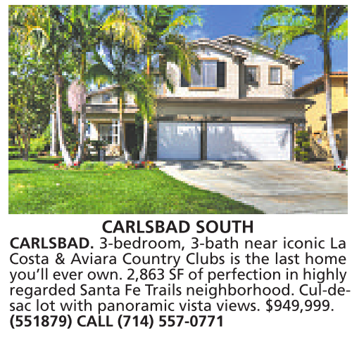 CARLSBAD SOUTH CARLSBAD. 3-bedroom, 3-bath near iconic La Costa & Aviara Country Clubs is the last home you’ll ever own. 2,863 SF of perfection in highly regarded Santa Fe Trails neighborhood. Cul-desac lot with panoramic vista views. $949,999. (551879) CALL (714) 557-0771