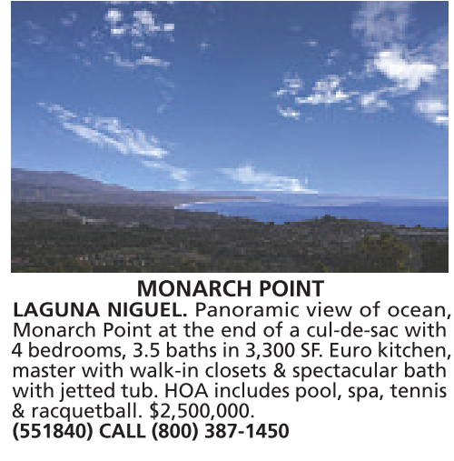 MONARCH POINT LAGUNA NIGUEL. Panoramic view of ocean, Monarch Point at the end of a cul-de-sac with 4bedrooms,3.5 bathsin3,300 SF.Euro kitchen, master with walk-in closets & spectacular bath with jetted tub. HOA includespool, spa, tennis & racquetball. $2,500,000. (551840) CALL (800) 387-1450