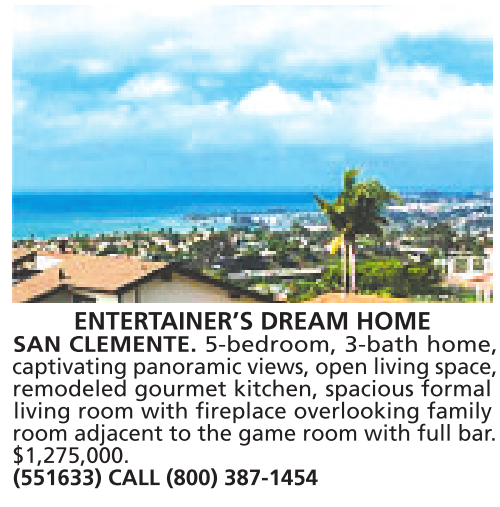 ENTERTAINER’S DREAM HOME SAN CLEMENTE. 5-bedroom, 3-bath home, captivating panoramic views, open living space, remodeled gourmet kitchen, spacious formal living room with fireplace overlooking family room adjacent to the game room with full bar. $1,275,000. (551633) CALL (800) 387-1454