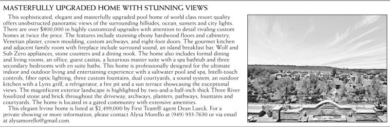 This elegant Irvine home is listed at $2,499,000 by First Team® agent Dean Lueck. For a private showing or more information, please contact Alysa Morello at (949) 933-7630 or via email at alysamorello@gmail.com.
