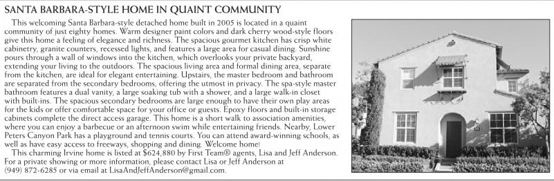 SANTA BARBARA-STYLE HOME IN QUAINT COMMUNITY This welcoming Santa Barbara-style detached home built in 2005 is located in a quaint community of just eighty homes. Warm designer paint colors and dark cherry wood-style floors give this home a feeling of elegance and richness. The spacious gourmet kitchen has crisp white cabinetry, granite counters, recessed lights, and features a large area for casual dining. Sunshine pours through a wall of windows into the kitchen, which overlooks your private backyard, extending your living to the outdoors. The spacious living area and formal dining area, separate from the kitchen, are ideal for elegant entertaining. Upstairs, the master bedroom and bathroom are separated from the secondary bedrooms, offering the utmost in privacy. The spa-style master bathroom features a dual vanity, a large soaking tub with a shower, and a large walk-in closet with built-ins. The spacious secondary bedrooms are large enough to have their own play areas for the kids or offer comfortable space for your office or guests. Epoxy floors and built-in storage cabinets complete the direct access garage. This home is a short walk to association amenities, where you can enjoy a barbecue or an afternoon swim while entertaining friends. Nearby, Lower Peters Canyon Park has a playground and tennis courts. You can attend award-winning schools, as well as have easy access to freeways, shopping and dining. Welcome home! This charming Irvine home is listed at $624,880 by First Team® agents, Lisa and Jeff Anderson. For a private showing or more information, please contact Lisa or Jeff Anderson at (949) 872-6285 or via email at LisaAndJeffAnderson@gmail.com.