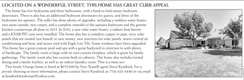 LOCATED ON A WONDERFUL STREET, THIS HOME HAS GREAT CURB APPEAL The home has five bedrooms and three bathrooms, with a hard-to-find master bedroom downstairs. There is also has an additional bedroom downstairs for guests, and three of the bedrooms are upstairs. The seller has done plenty of upgrades, including a tankless water heater, new paint outside, new carpet, and a complete remodel of the upstairs bathroom and the granite kitchen countertops all done in 2013. In 2010, a new solar water heater, a radiant heat barrier and a KVAR PFC unit were installed. The home also has a complete copper re-pipe, sixty solar panels that are owned (not leased) to save money, new invertors for solar panels, newer central air conditioning and heat, and newer roof with Eagle Lite Tile. Some windows have been upgraded. This home has a great custom pool and spa with a great backyard to entertain in with plenty of hardscape. The family room is large with its own custom fireplace, which is great for family gatherings. The family room also has custom built-in cabinets. The home also includes formal dining and a family kitchen, as well as an indoor laundry room. This is a must see! This lovely Orange home is listed at $675,000 by First Team® agent Steve Kendrick. For a private showing or more information, please contact Steve Kendrick at (714) 624-6440 or via email at kendrick4realestate@yahoo.com.