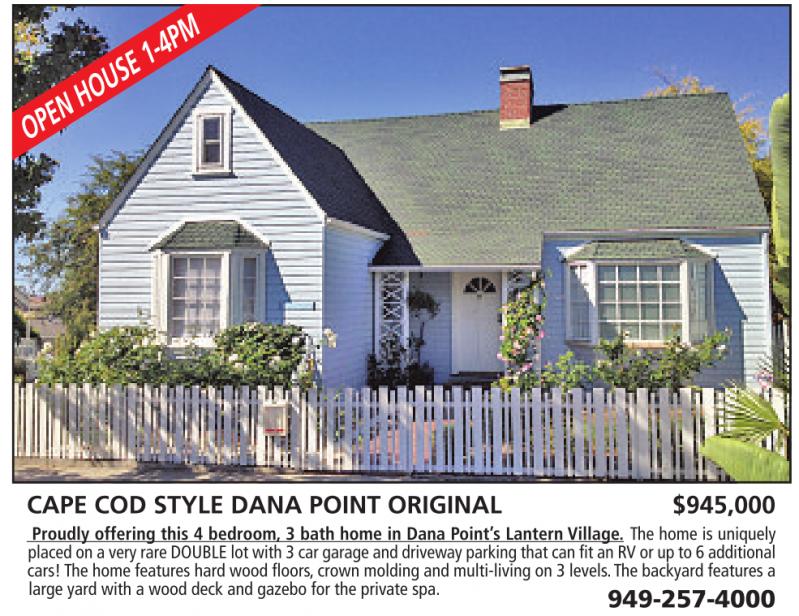 CAPE COD STYLE DANA POINT ORIGINAL $945,000 Proudly offering this 4 bedroom, 3 bath home in Dana Point’s Lantern Village. The home is uniquely placed on avery rare DOUBLE lot with 3car garage and driveway parking that can fit an RV or up to 6additional cars! Thehome features hard wood floors,crown molding and multi-living on 3levels.The backyard features a large yard with awood deck and gazebo for the private spa. 949-257-4000