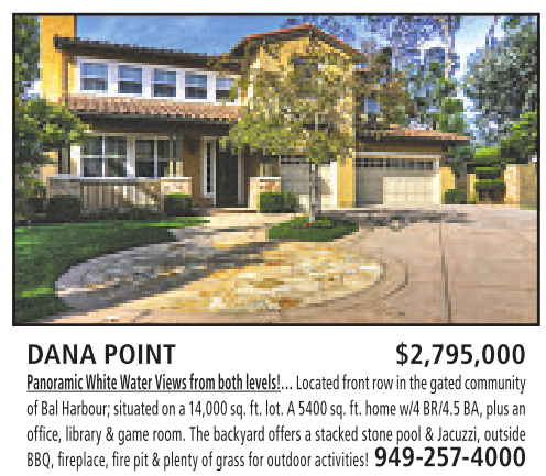 DANA POINT $2,795,000 Panoramic WhiteWater Viewsfrombothlevels!… Located frontrow in thegated community of BalHarbour;situatedona14,000 sq. ft.lot.A5400 sq. ft.home w/4BR/4.5BA, plus an office, library &game room. The backyard offers astacked stone pool &Jacuzzi, outside BBQ, fireplace, fire pit &plenty ofgrass for outdoor activities! 949-257-4000