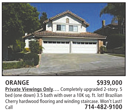 bed (one down)3.5 bath with overa10K sq.ft. lot! Brazilian Cherry hardwood flooring andwinding staircase.Won’t Last! Call 714-482-9100