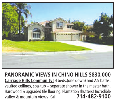 PANORAMICVIEWS IN CHINO HILLS$830,000 Carriage HillsCommunity! 4beds.(one down)and 2.5baths, vaulted ceilings,spa-tub +separateshowerinthe masterbath. Hardwood &upgraded tile flooring.Plantationshutters! Incredible valley &mountain views! Call 714-482-9100