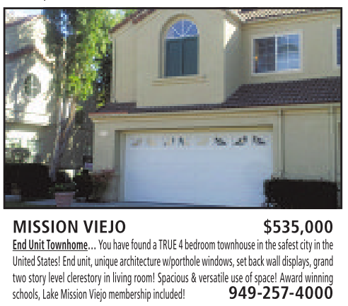 MISSION VIEJO $535,000 EndUnit Townhome… Youhave found aTRUE4bedroomtownhouse in thesafestcityinthe UnitedStates! Endunit, unique architecture w/porthole windows, set back wall displays, grand two story level clerestory inliving room! Spacious &versatile use ofspace! Award winning schools,LakeMission Viejo membershipincluded! 949-257-4000