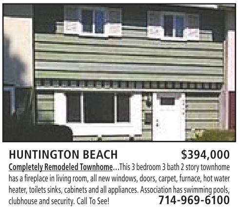 HUNTINGTON BEACH $394,000 Completely Remodeled Townhome…This 3bedroom3bath2story townhome hasafireplaceinliving room,all new windows, doors,carpet, furnace,hot water heater,toilets sinks, cabinets andall appliances. Association hasswimmingpools, clubhouseand security. Call To See! 714-969-6100