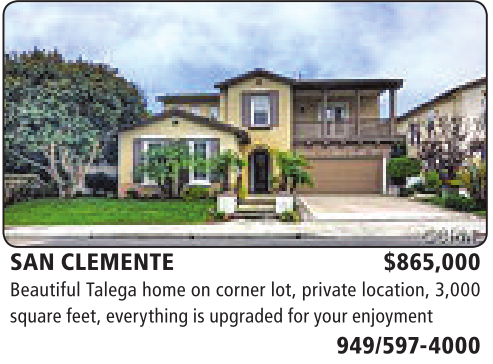 SAN CLEMENTE $865,000 Beautiful Talega home on corner lot, private location, 3,000 squarefeet, everythingisupgraded foryour enjoyment 949/597-4000