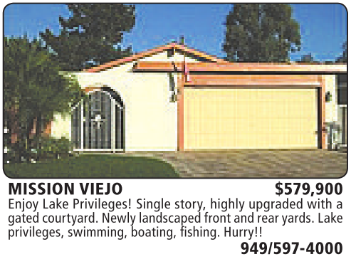 MISSION VIEJO $579,900 Enjoy Lake Privileges! Single story, highly upgraded with a gatedcourtyard. Newly landscaped frontand rear yards.Lake privileges,swimming, boating, fishing.Hurry!!