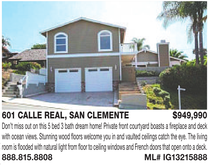 601 CALLE REAL, SAN CLEMENTE $949,990 Don’t miss out on this 5bed 3bath dream home! Private front courtyard boasts afireplace and deck with ocean views. Stunning wood floors welcome you inand vaulted ceilings catch the eye. The living room is flooded with natural lightfromfloor to ceiling windows andFrench doorsthat open onto adeck. 888.815.8808 ML# IG13215888