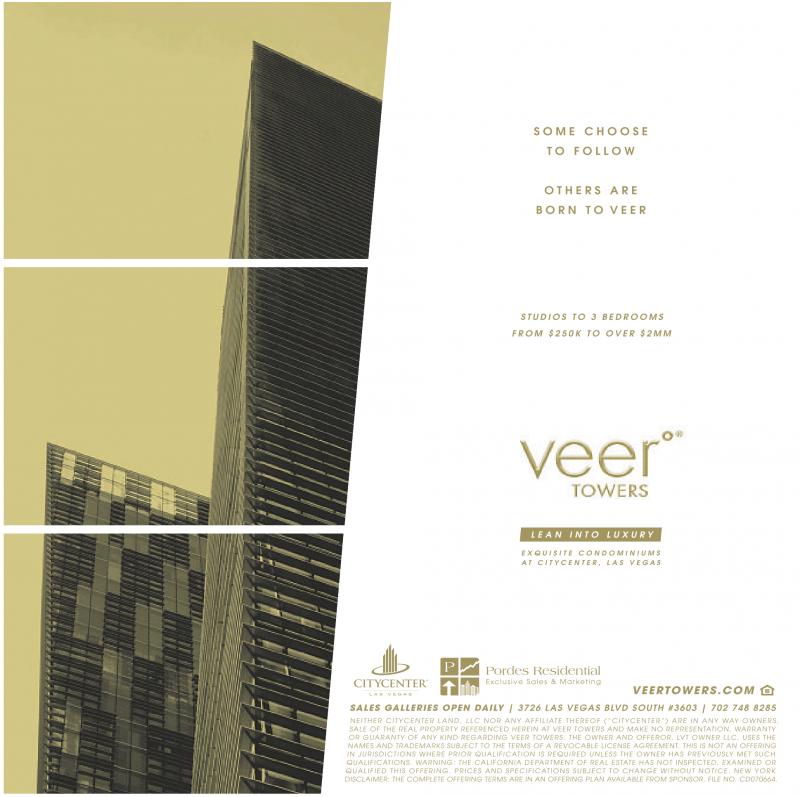 NEITHER CITYCENTER LAND, LLC NOR ANY AFFILIATE THEREOF (“CITYCENTER”) ARE IN ANY WAY OWNERS, SALE OF THE REAL PROPERTY REFERENCED HEREIN AT VEER TOWERS AND MAKE NO REPRESENTATION, WARRANTY OR GUARANTY OF ANY KIND REGARDING VEER TOWERS. THE OWNER AND OFFEROR, LVT OWNER LLC, USES THE NAMES AND TRADEMARKS SUBJECT TO THE TERMS OF A REVOCABLE LICENSE AGREEMENT. THIS IS NOT AN OFFERING IN JURISDICTIONS WHERE PRIOR QUALIFICATION IS REQUIRED UNLESS THE OWNER HAS PREVIOUSLY MET SUCH QUALIFICATIONS. WARNING: THE CALIFORNIA DEPARTMENT OF REAL ESTATE HAS NOT INSPECTED, EXAMINED OR QUALIFIED THIS OFFERING. PRICES AND SPECIFICATIONS SUBJECT TO CHANGE WITHOUT NOTICE. NEW YORK DISCLAIMER: THE COMPLETE OFFERING TERMS ARE IN AN OFFERING PLAN AVAILABLE FROM SPONSOR. FILE NO. CD070664.