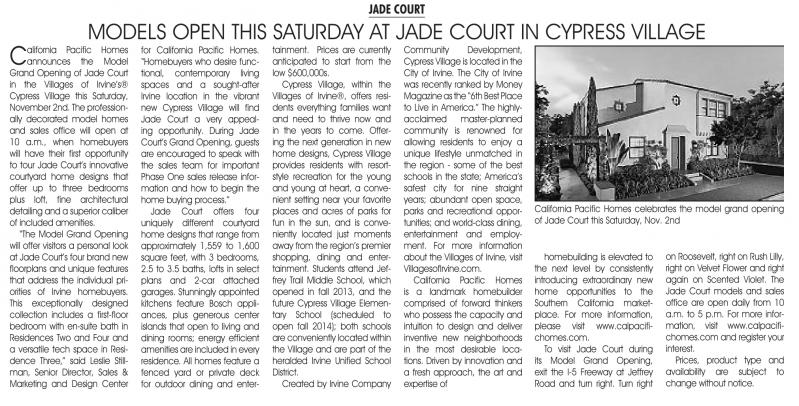 for california Pacific Homes. “Homebuyers who desire functional, contemporary living spaces and a sought-after irvine location in the vibrant new cypress Village will find Jade court a very appealing opportunity. During Jade court’s Grand opening, guests are encouraged to speak with the sales team for important Phase one sales release information and how to begin the home buying process.”