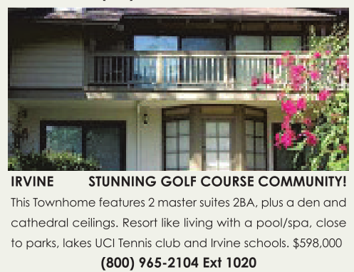 downstairs IRVINE STUNNING GOLF COURSE COMMUNITY! ThisTownhome features 2master suites 2BA, plus aden and cathedral ceilings. Resort like living with apool/spa, close to parks, lakes UCI Tennis club and Irvine schools. $598,000 (800) 965-2104 Ext 1020