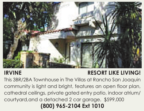 IRVINE RESORT LIKE LIVING! This 3BR/2BATownhouse in The Villas at Rancho San Joaquin community islight and bright, features an open floor plan, cathedral ceilings, private gated entry patio, indoor atrium/ courtyard,and adetached 2car garage. $599,000 (800) 965-2104 Ext 1010 See also
