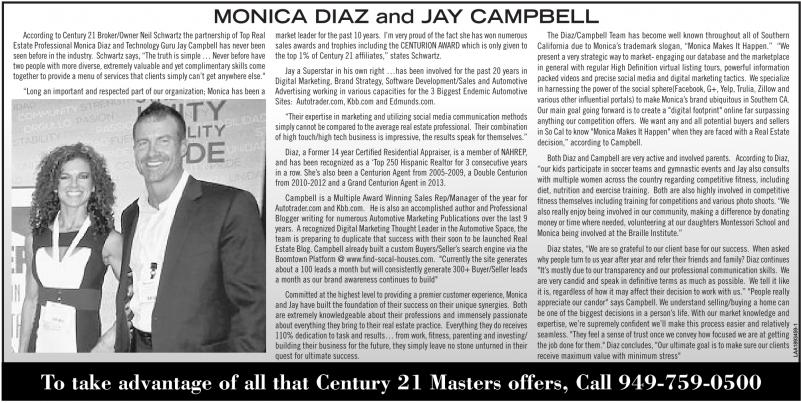 The Diaz/Campbell Team has become well known throughout all of Southern California due to Monica’s trademark slogan, “Monica Makes It Happen.” “We present avery strategic way to market- engaging our database and the marketplace in general with regular High Definition virtual listing tours, powerful information packed videos and precise social media and digital marketing tactics. We specialize in harnessing the power of the social sphere(Facebook, G+, Yelp, Trulia, Zillow and various other influential portals) to make Monica’sbrand ubiquitous in Southern CA. Our main goal going forward is to create a"digital footprint" online far surpassing anything our competition offers. Wewant any and all potential buyers and sellers in So Cal to know "Monica Makes It Happen" when they are faced with aReal Estate decision,” according to Campbell.