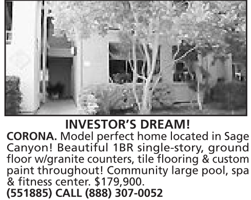 INVESTOR’S DREAM! CORONA. Model perfect home located in Sage Canyon! Beautiful 1BR single-story, ground floor w/granite counters, tile flooring &custom paint throughout! Community large pool, spa & fitness center. $179,900. (551885) CALL (888) 307-0052