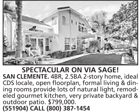 SPECTACULAR ON VIA SAGE! SAN CLEMENTE. 4BR, 2.5BA 2-story home, ideal CDSlocale, open floorplan, formal living &diningrooms provide lots of natural light, remodeled gourmetkitchen, very private backyard &outdoor patio. $799,000. (551904) CALL (800) 387-1454