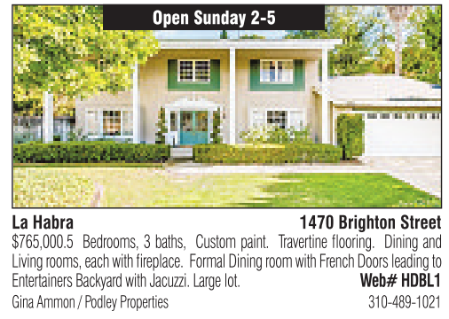 La Habra Open Sunday 2-5 1470 Brighton Street Gina Ammon /Podley Properties 310-489-1021 $765,000.5 Bedrooms, 3baths, Custom paint. Travertine flooring. Dining and Living rooms, each with fireplace. Formal Dining room with French Doors leading to Entertainers Backyardwith Jacuzzi. Largelot. Web# HDBL1