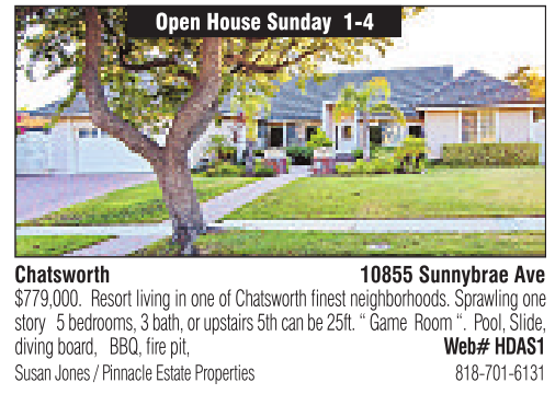 $779,000. Resortliving in one of Chatsworth finest neighborhoods. Sprawling one story 5bedrooms, 3bath, or upstairs 5th can be 25ft. “Game Room “. Pool, Slide, diving board, BBQ, firepit, Web# HDAS1 Susan Jones /Pinnacle Estate Properties 818-701-6131