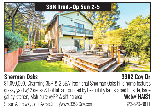 $1,099,000. Charming 3BR &2.5BA Traditional Sherman Oaks hills home features grassy yardw/2decks &hot tub surrounded by beautifully landscaped hillside, large galley kitchen, Mstr suite w/FP &sitting area Web# HAIS1 Susan Andrews /JohnAaroeGroup/www.3392Coy.com 323-829-8811