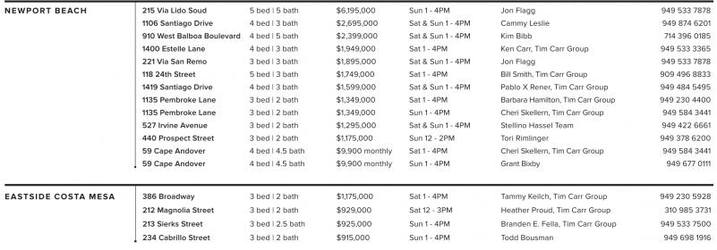 NEWPORT BEACH 215 Via Lido Soud 5 bed | 5 bath $6,195,000 Sun 1 - 4PM Jon Flagg 949 533 7878 1106 Santiago Drive 4 bed | 3 bath $2,695,000 Sat & Sun 1 - 4PM Cammy Leslie 949 874 6201 910 West Balboa Boulevard 4 bed | 5 bath $2,399,000 Sat & Sun 1 - 4PM Kim Bibb 714 396 0185 1400 Estelle Lane 4 bed | 3 bath $1,949,000 Sat 1 - 4PM Ken Carr, Tim Carr Group 949 533 3365 221 Via San Remo 3 bed | 3 bath $1,895,000 Sat & Sun 1 - 4PM Jon Flagg 949 533 7878 118 24th Street 5 bed | 3 bath $1,749,000 Sat 1 - 4PM Bill Smith, Tim Carr Group 909 496 8833 1419 Santiago Drive 4 bed | 3 bath $1,599,000 Sat & Sun 1 - 4PM Pablo X Rener, Tim Carr Group 949 484 5495 1135 Pembroke Lane 3 bed | 2 bath $1,349,000 Sat 1 - 4PM Barbara Hamilton, Tim Carr Group 949 230 4400 1135 Pembroke Lane 3 bed | 2 bath $1,349,000 Sun 1 - 4PM Cheri Skellern, Tim Carr Group 949 584 3441 527 Irvine Avenue 3 bed | 2 bath $1,295,000 Sat & Sun 1 - 4PM Stellino Hassel Team 949 422 6661 440 Prospect Street 3 bed | 2 bath $1,175,000 Sun 12 - 2PM Tori Rimlinger 949 378 6200 59 Cape Andover 4 bed | 4.5 bath $9,900 monthly Sat 1 - 4PM Cheri Skellern, Tim Carr Group 949 584 3441 59 Cape Andover 4 bed | 4.5 bath $9,900 monthly Sun 1 - 4PM Grant Bixby 949 677 0111
