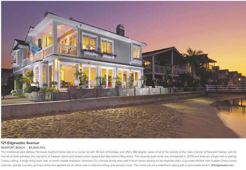 NEWPORT BEACH | $5,600,000 This traditional-style Balboa Peninsula bayfront home sits on a corner lot with 45 feet of frontage and offers 180 degree views of all of the activity of the main channel of Newport Harbor, with its myriad of boat activities, the city lights of Fashion Island and distant snow-capped San Bernardino Mountains. This recently built home was remodeled in 2009 and features a foyer with a soaring 2-story ceiling, a large living room with a corner marble fireplace, recessed TV, a formal dining area with French doors leading to the bayside patio, a gourmet kitchen with custom Cherry wood cabinets, granite counters and top-of-the-line appliances, an office with a coffered ceiling, and powder room. The home sits on a waterfront setting with a swimmable beach. 121edgewater.com
